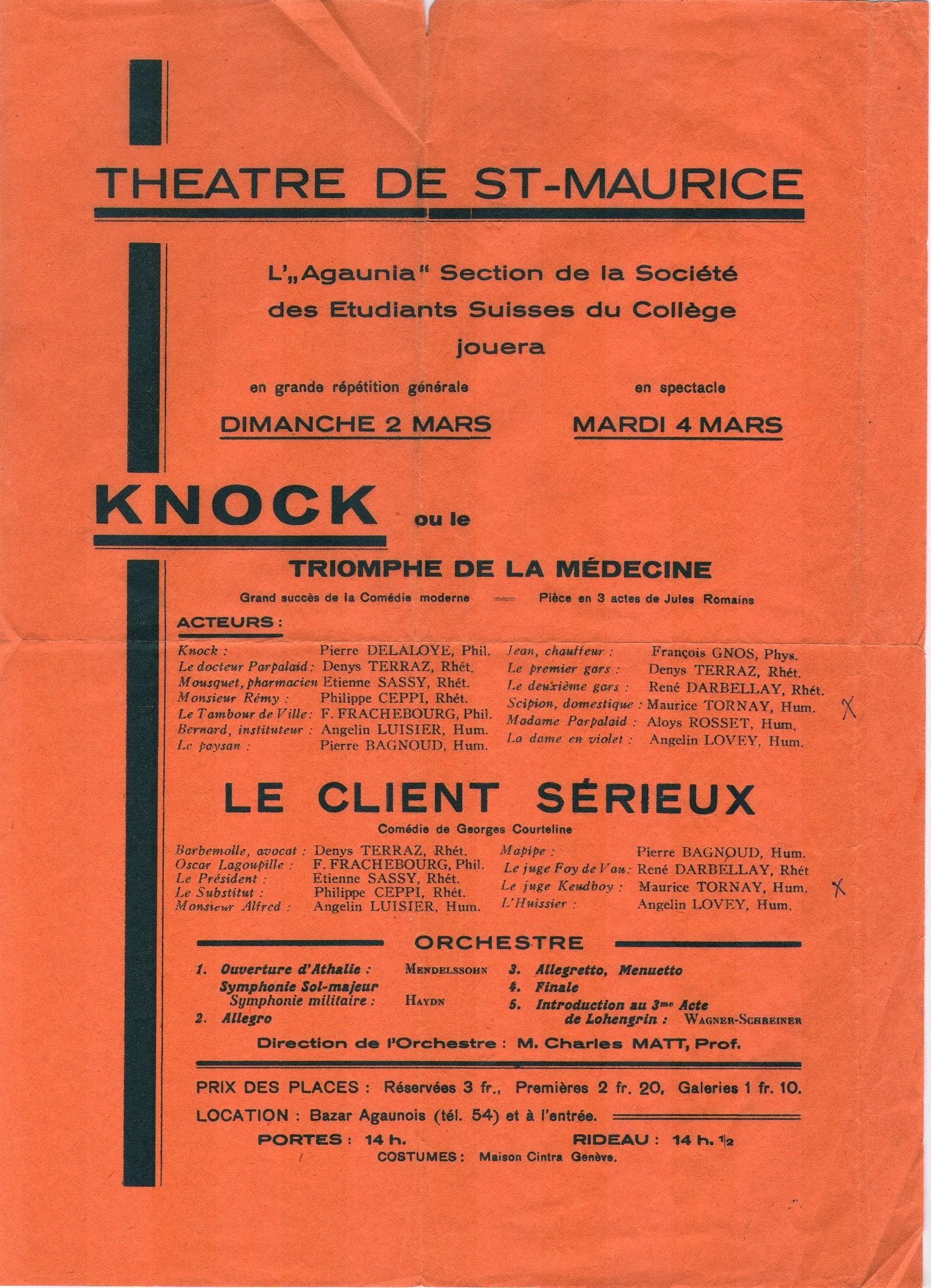 Mardi 4 mars 1930 à 14 h 30 a lieu au théâtre de St-Maurice la représentation en spectacle de Knock ou le triomphe de la médecine, pièce en 3 actes de Jules Romain, suivie par Le Client sérieux, comédie de Georges Courteline, le tout joué par des étudiants de l’Agaunia, section de la société des étudiants suisses du Collège. Maurice fait partie du casting des deux pièces de théâtre. Jeune chrétien parmi les hommes, il y vit, se donne et manifeste ainsi la beauté de la vie au quotidien. C’est sa manière de vivre l’apostolat des laïcs dans le monde.