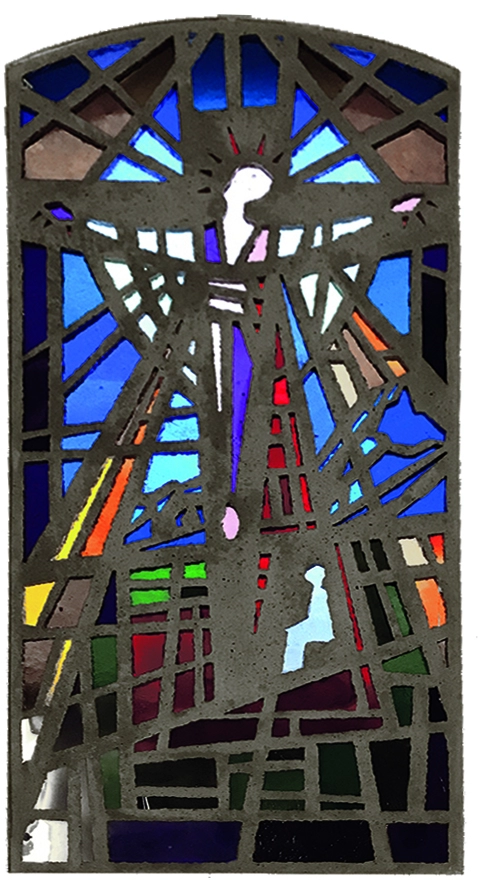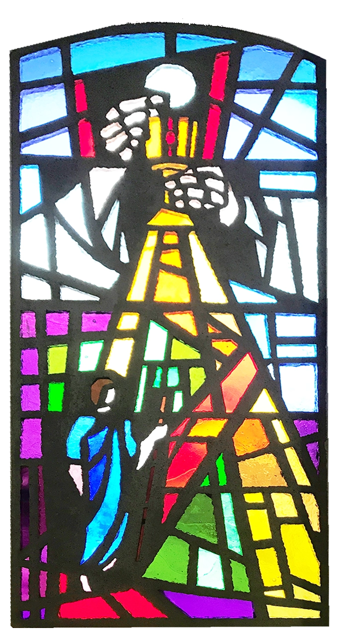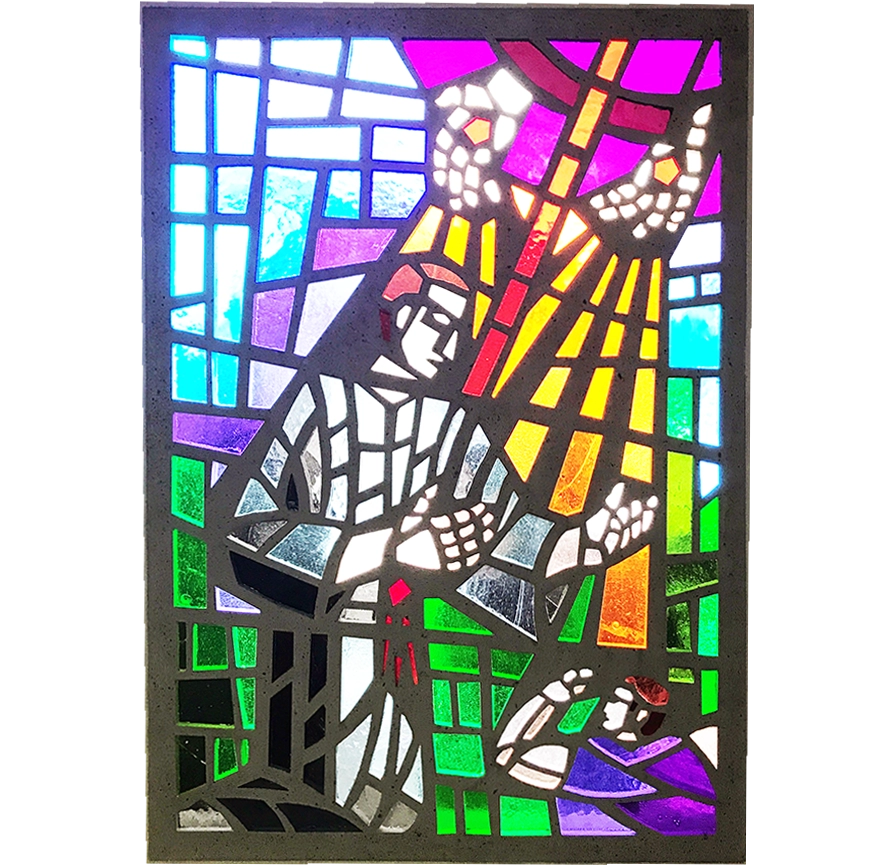 Sur le vitrail les mains du Christ accueillent le Père Tornay et Doci
